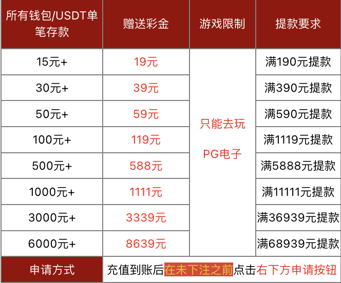 **注意:**本活动不与《PG电子以小博大》共享,一笔存款只能申请一项优惠!街机游戏,棋牌百家乐,21点,电子桌面游戏不参与此活动。