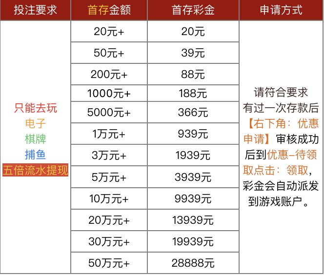 **例如:**新会员首次存款5000元后通过【优惠申请】提交对应金额申请,即可获得366元首存彩金。则需完成(5000+366)×5=26830 元流水即可提款!!